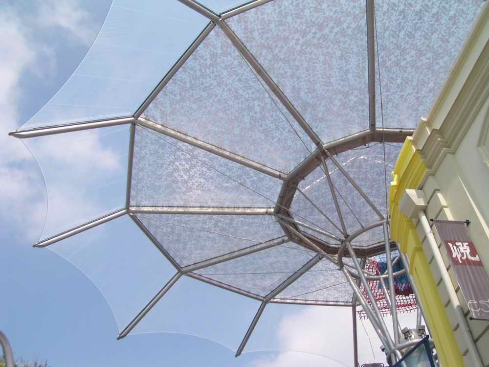 4、美觀 因?yàn)槟げ牧暇哂型腹庑?,?shí)際結(jié)構(gòu)中可以清楚地看見(jiàn)焊縫,所以裁剪縫的布置一定要規(guī)則、合理,最好能形成一些漂亮的圖案以增加結(jié)構(gòu)的美感。如果膜表面設(shè)置有壓索或脊索, 那么最好使裁剪縫與壓索或脊索重合,使索不至于打亂焊縫的圖案布置。
