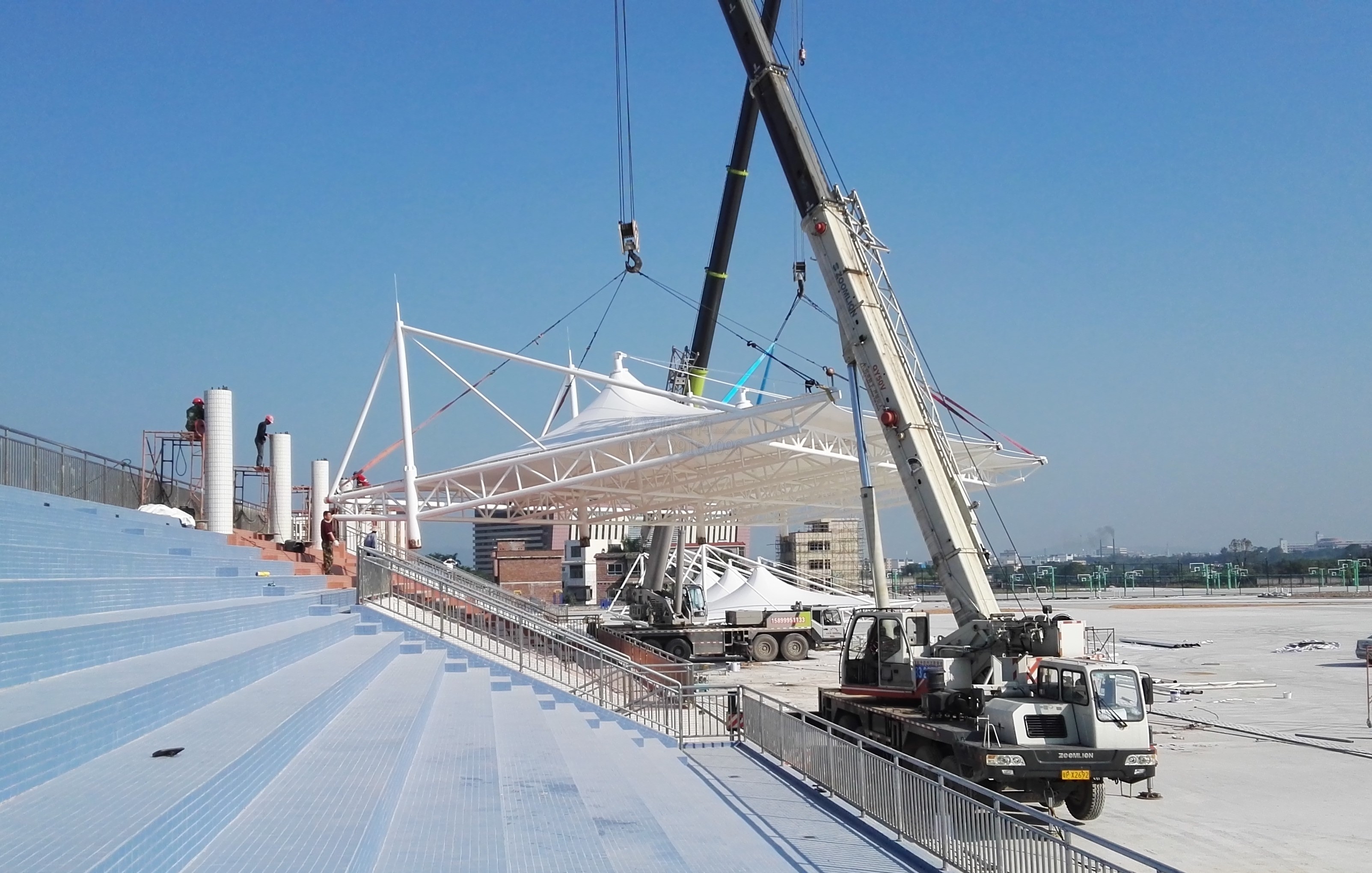 廣州機電學校膜結(jié)構(gòu)看臺,經(jīng)過前期的一系列準備工作,今天已經(jīng)到達最關(guān)鍵的吊裝階段。本文就現(xiàn)場施工情況進行一個簡單播報,一起去看看吧。